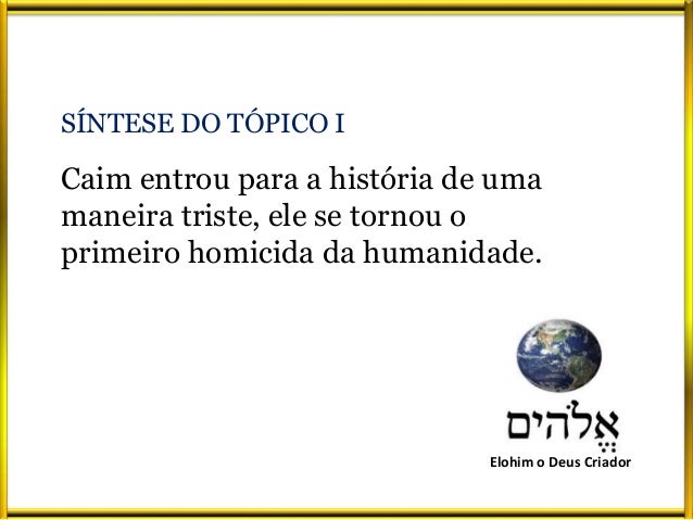 - 10. Elohim o Deus Criador SÍNTESE DO TÓPICO I Caim entrou para a história de uma maneira triste, ele se tornou o primeiro homicida da humanidade.