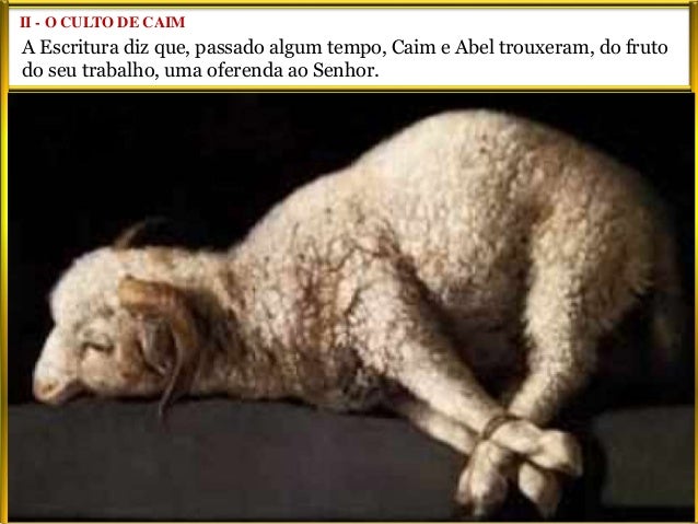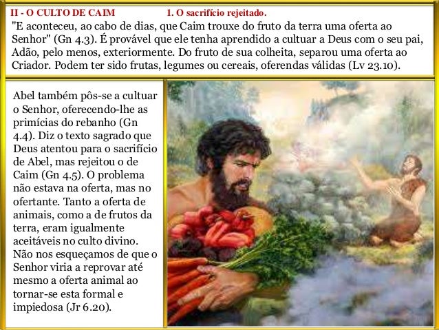 - 12. II - O CULTO DE CAIM 1. O sacrifício rejeitado. "E aconteceu, ao cabo de dias, que Caim trouxe do fruto da terra uma oferta ao Senhor" (Gn 4.3). É provável que ele tenha aprendido a cultuar a Deus com o seu pai, Adão, pelo menos, exteriormente. Do fruto de sua colheita, separou uma oferta ao Criador. Podem ter sido frutas, legumes ou cereais, oferendas válidas (Lv 23.10). Abel também pôs-se a cultuar o Senhor, oferecendo-lhe as primícias do rebanho (Gn 4.4). Diz o texto sagrado que Deus atentou para o sacrifício de Abel, mas rejeitou o de Caim (Gn 4.5). O problema não estava na oferta, mas no ofertante. Tanto a oferta de animais, como a de frutos da terra, eram igualmente aceitáveis no culto divino. Não nos esqueçamos de que o Senhor viria a reprovar até mesmo a oferta animal ao tornar-se esta formal e impiedosa (Jr 6.20).