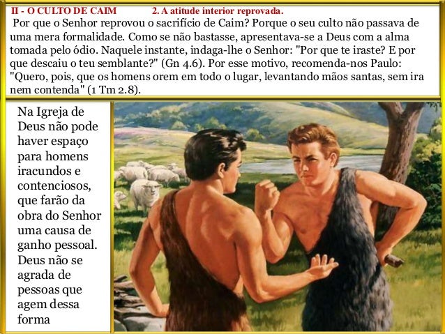- 13. II - O CULTO DE CAIM 2. A atitude interior reprovada. Na Igreja de Deus não pode haver espaço para homens iracundos e contenciosos, que farão da obra do Senhor uma causa de ganho pessoal. Deus não se agrada de pessoas que agem dessa forma Por que o Senhor reprovou o sacrifício de Caim? Porque o seu culto não passava de uma mera formalidade. Como se não bastasse, apresentava-se a Deus com a alma tomada pelo ódio. Naquele instante, indaga-lhe o Senhor: "Por que te iraste? E por que descaiu o teu semblante?" (Gn 4.6). Por esse motivo, recomenda-nos Paulo: "Quero, pois, que os homens orem em todo o lugar, levantando mãos santas, sem ira nem contenda" (1 Tm 2.8).