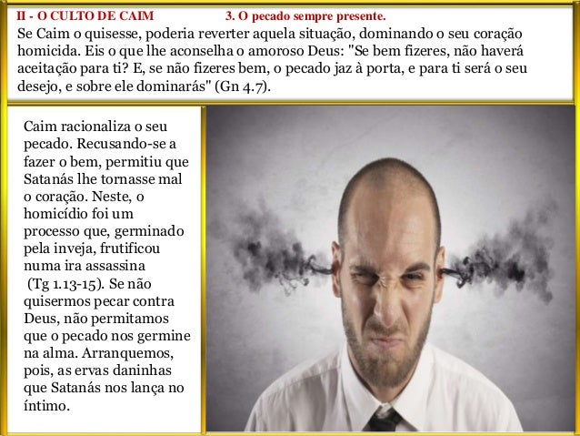 - 14. II - O CULTO DE CAIM 3. O pecado sempre presente. Caim racionaliza o seu pecado. Recusando-se a fazer o bem, permitiu que Satanás lhe tornasse mal o coração. Neste, o homicídio foi um processo que, germinado pela inveja, frutificou numa ira assassina (Tg 1.13-15). Se não quisermos pecar contra Deus, não permitamos que o pecado nos germine na alma. Arranquemos, pois, as ervas daninhas que Satanás nos lança no íntimo. Se Caim o quisesse, poderia reverter aquela situação, dominando o seu coração homicida. Eis o que lhe aconselha o amoroso Deus: "Se bem fizeres, não haverá aceitação para ti? E, se não fizeres bem, o pecado jaz à porta, e para ti será o seu desejo, e sobre ele dominarás" (Gn 4.7).