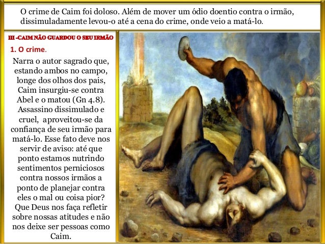 - 15. O crime de Caim foi doloso. Além de mover um ódio doentio contra o irmão, dissimuladamente levou-o até a cena do crime, onde veio a matá-lo. Narra o autor sagrado que, estando ambos no campo, longe dos olhos dos pais, Caim insurgiu-se contra Abel e o matou (Gn 4.8). Assassino dissimulado e cruel, aproveitou-se da confiança de seu irmão para matá-lo. Esse fato deve nos servir de aviso: até que ponto estamos nutrindo sentimentos perniciosos contra nossos irmãos a ponto de planejar contra eles o mal ou coisa pior? Que Deus nos faça refletir sobre nossas atitudes e não nos deixe ser pessoas como Caim. 1. O crime.