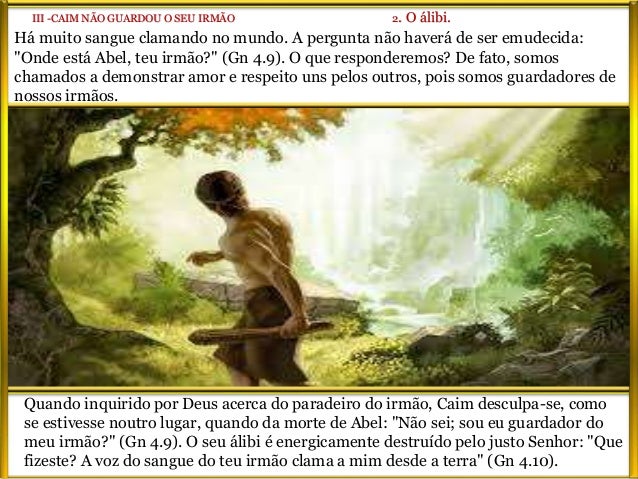 - 16. III -CAIM NÃO GUARDOU O SEU IRMÃO 2. O álibi. Há muito sangue clamando no mundo. A pergunta não haverá de ser emudecida: "Onde está Abel, teu irmão?" (Gn 4.9). O que responderemos? De fato, somos chamados a demonstrar amor e respeito uns pelos outros, pois somos guardadores de nossos irmãos. Quando inquirido por Deus acerca do paradeiro do irmão, Caim desculpa-se, como se estivesse noutro lugar, quando da morte de Abel: "Não sei; sou eu guardador do meu irmão?" (Gn 4.9). O seu álibi é energicamente destruído pelo justo Senhor: "Que fizeste? A voz do sangue do teu irmão clama a mim desde a terra" (Gn 4.10).