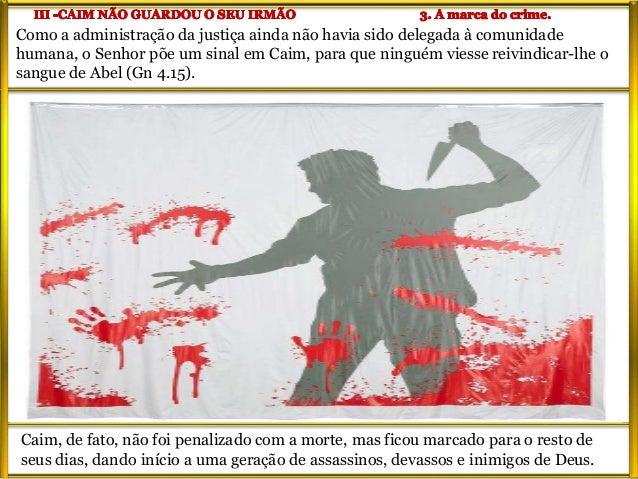 - 17. Caim, de fato, não foi penalizado com a morte, mas ficou marcado para o resto de seus dias, dando início a uma geração de assassinos, devassos e inimigos de Deus. Como a administração da justiça ainda não havia sido delegada à comunidade humana, o Senhor põe um sinal em Caim, para que ninguém viesse reivindicar-lhe o sangue de Abel (Gn 4.15).