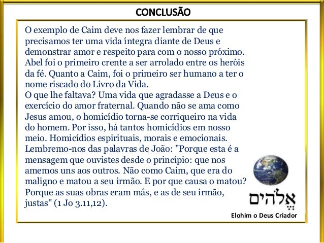 - 18. Elohim o Deus Criador O exemplo de Caim deve nos fazer lembrar de que precisamos ter uma vida íntegra diante de Deus e demonstrar amor e respeito para com o nosso próximo. Abel foi o primeiro crente a ser arrolado entre os heróis da fé. Quanto a Caim, foi o primeiro ser humano a ter o nome riscado do Livro da Vida. O que lhe faltava? Uma vida que agradasse a Deus e o exercício do amor fraternal. Quando não se ama como Jesus amou, o homicídio torna-se corriqueiro na vida do homem. Por isso, há tantos homicídios em nosso meio. Homicídios espirituais, morais e emocionais. Lembremo-nos das palavras de João: "Porque esta é a mensagem que ouvistes desde o princípio: que nos amemos uns aos outros. Não como Caim, que era do maligno e matou a seu irmão. E por que causa o matou? Porque as suas obras eram más, e as de seu irmão, justas" (1 Jo 3.11,12).