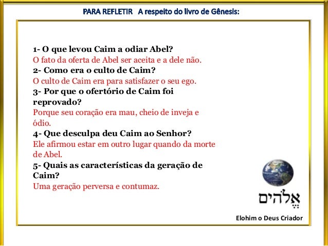 - 19. Elohim o Deus Criador 1- O que levou Caim a odiar Abel? O fato da oferta de Abel ser aceita e a dele não. 2- Como era o culto de Caim? O culto de Caim era para satisfazer o seu ego. 3- Por que o ofertório de Caim foi reprovado? Porque seu coração era mau, cheio de inveja e ódio. 4- Que desculpa deu Caim ao Senhor? Ele afirmou estar em outro lugar quando da morte de Abel. 5- Quais as características da geração de Caim? Uma geração perversa e contumaz