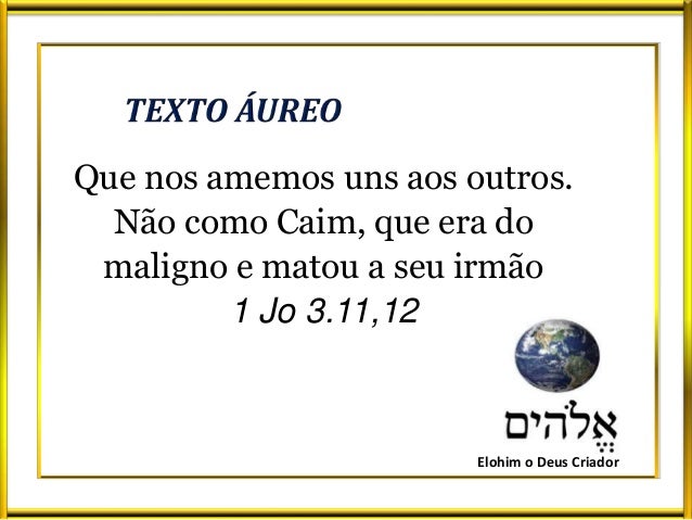 - 2. Elohim o Deus Criador Que nos amemos uns aos outros. Não como Caim, que era do maligno e matou a seu irmão 1 Jo 3.11,12