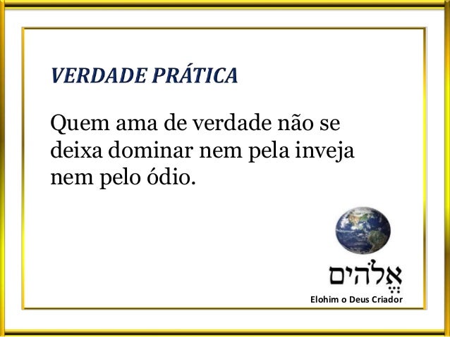 - 3. Elohim o Deus Criador Quem ama de verdade não se deixa dominar nem pela inveja nem pelo ódio.
