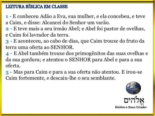 - 5 - Mas para Caim e para a sua oferta não atentou. E irou-se Caim fortemente, e descaiu-lhe o seu semblante. Elohim o Deus Criador