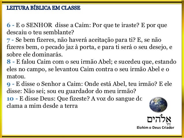 - 10 - E disse Deus: Que fizeste? A voz do sangue do teu irmão clama a mim desde a terra Elohim o Deus Criador