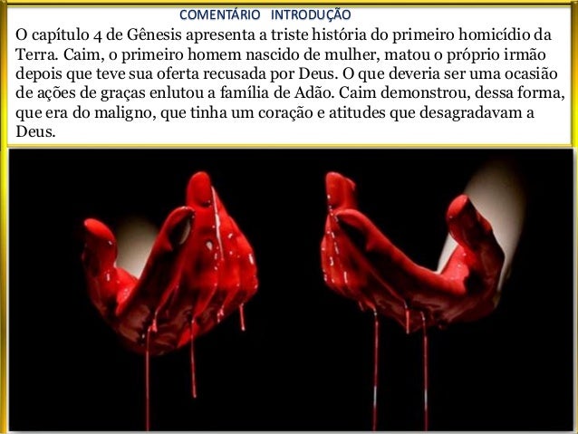 - 6. COMENTÁRIO INTRODUÇÃO O capítulo 4 de Gênesis apresenta a triste história do primeiro homicídio da Terra. Caim, o primeiro homem nascido de mulher, matou o próprio irmão depois que teve sua oferta recusada por Deus. O que deveria ser uma ocasião de ações de graças enlutou a família de Adão. Caim demonstrou, dessa forma, que era do maligno, que tinha um coração e atitudes que desagradavam a Deus.