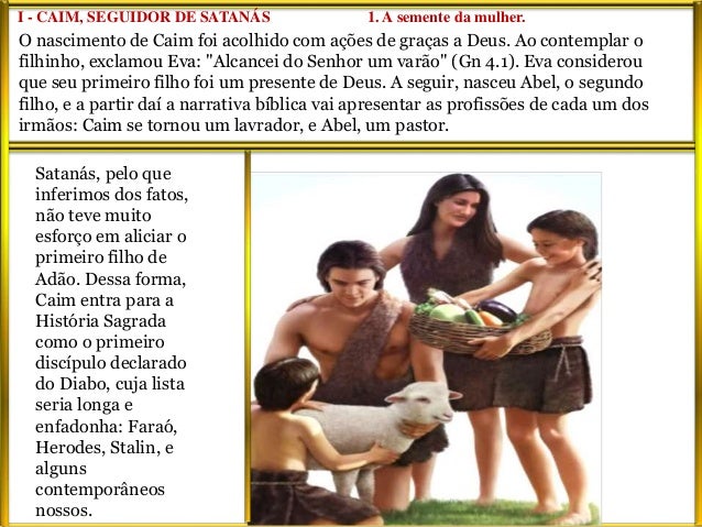 - 7. I - CAIM, SEGUIDOR DE SATANÁS 1. A semente da mulher. Satanás, pelo que inferimos dos fatos, não teve muito esforço em aliciar o primeiro filho de Adão. Dessa forma, Caim entra para a História Sagrada como o primeiro discípulo declarado do Diabo, cuja lista seria longa e enfadonha: Faraó, Herodes, Stalin, e alguns contemporâneos nossos. O nascimento de Caim foi acolhido com ações de graças a Deus. Ao contemplar o filhinho, exclamou Eva: "Alcancei do Senhor um varão" (Gn 4.1). Eva considerou que seu primeiro filho foi um presente de Deus. A seguir, nasceu Abel, o segundo filho, e a partir daí a narrativa bíblica vai apresentar as profissões de cada um dos irmãos: Caim se tornou um lavrador, e Abel, um pastor.