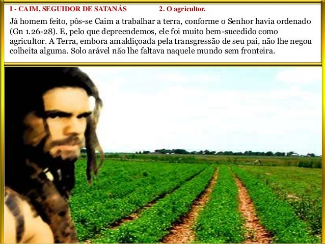 - 8. I - CAIM, SEGUIDOR DE SATANÁS 2. O agricultor. Já homem feito, pôs-se Caim a trabalhar a terra, conforme o Senhor havia ordenado (Gn 1.26-28). E, pelo que depreendemos, ele foi muito bem-sucedido como agricultor. A Terra, embora amaldiçoada pela transgressão de seu pai, não lhe negou colheita alguma. Solo arável não lhe faltava naquele mundo sem fronteira.