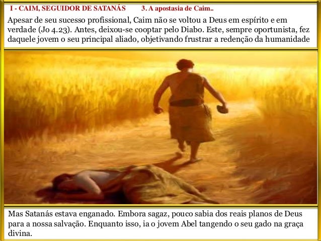 - 9. I - CAIM, SEGUIDOR DE SATANÁS 3. A apostasia de Caim.. Mas Satanás estava enganado. Embora sagaz, pouco sabia dos reais planos de Deus para a nossa salvação. Enquanto isso, ia o jovem Abel tangendo o seu gado na graça divina. Apesar de seu sucesso profissional, Caim não se voltou a Deus em espírito e em verdade (Jo 4.23). Antes, deixou-se cooptar pelo Diabo. Este, sempre oportunista, fez daquele jovem o seu principal aliado, objetivando frustrar a redenção da humanidade